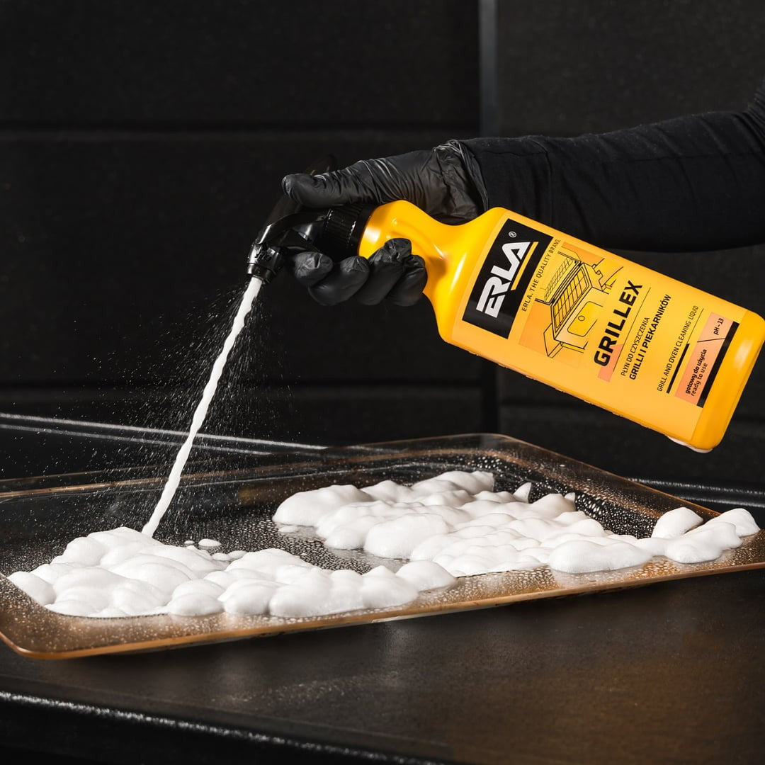 ERLA GRILLEX to mocny, zasadowy środek czyszczący, stworzony do skutecznego usuwania ekstremalnych zabrudzeń. Idealnie sprawdza się przy czyszczeniu grilli, piekarników, rusztów, garnków, patelni oraz szyb kominkowych, skutecznie eliminując przypalony tłuszcz, zwęglone resztki jedzenia i osady sadzy.